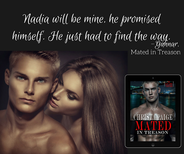 Their only hope lies with the treasonous Faction hell-bent on destroying the very people Gunnar calls family. Determined to find a way to be mated, Gunnar seeks out the leader of this hidden uprising. Together, Nadia and Gunnar must break every law and rite of their vampire culture to become bonded for life. Gunnar will play a deadly game of subversion or pay a blood price that would sever him from their people and put a bounty on his head. They must survive a dangerous infiltration of the Faction, because they’ll do anything to be together, even if it means being mated in treason.